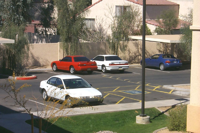 Our three cars parked facing away (red white & blue no less!)