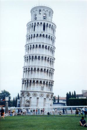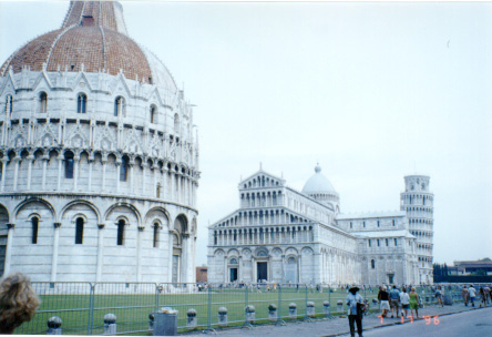 the bell tower for the church in pisa. On the far left is the baptistry of pisa.